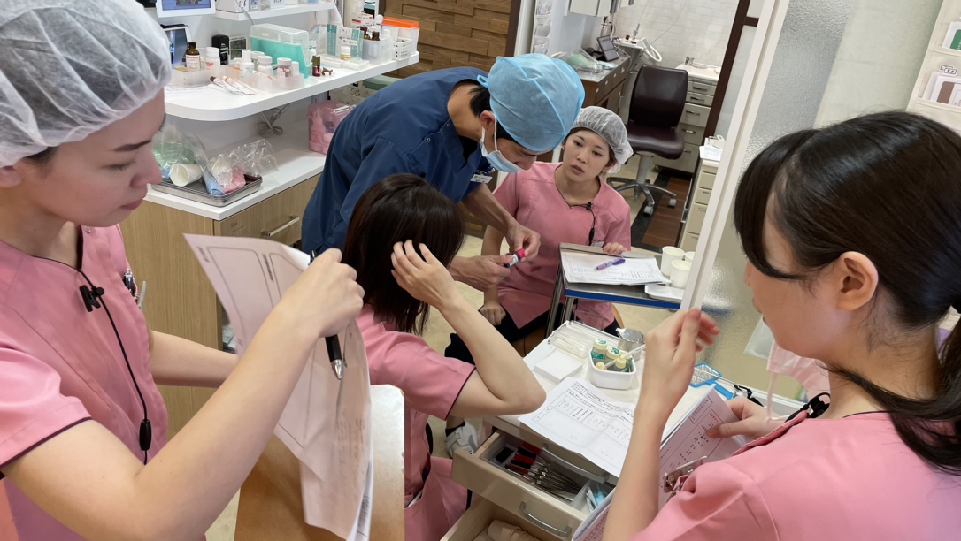 一方で、当院の『わかりやすい説明をモットー』とされている松上先生が、澁谷先生のサポートのもと、助手さん向けに