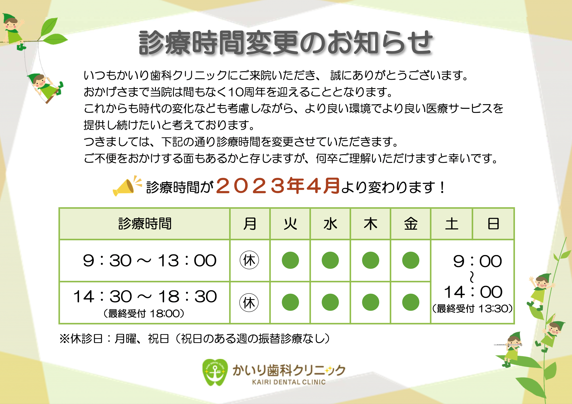 つきましては2023年度4月から下記の通り、診療時間を変更させて頂きます。