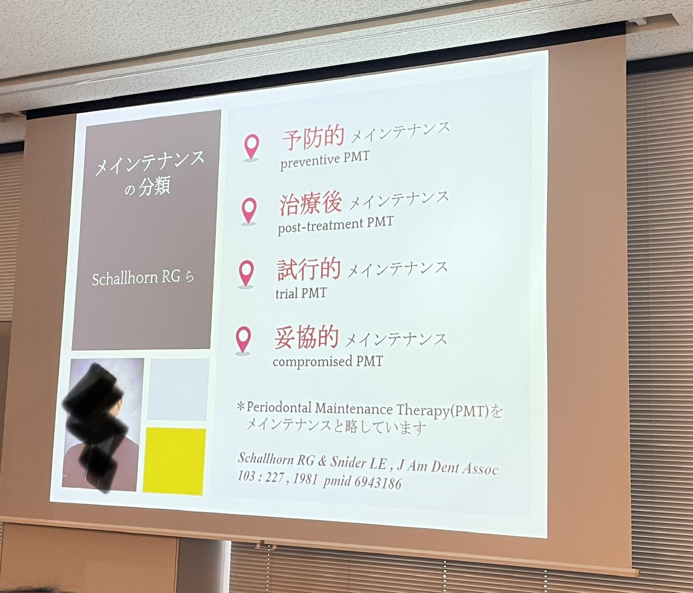 しかも今回は歯科衛生士向けの『メインテナンス』に関して掘り下げた内容で、歯科医師にも開放されたセミナーとなっており、治療がメインとなる歯科医師の私にとっては大変勉強になり有意義な時間を過ごすことができました。また、受講生のほとんどが歯科衛生士さんと思われる女性の方達で新鮮でした。