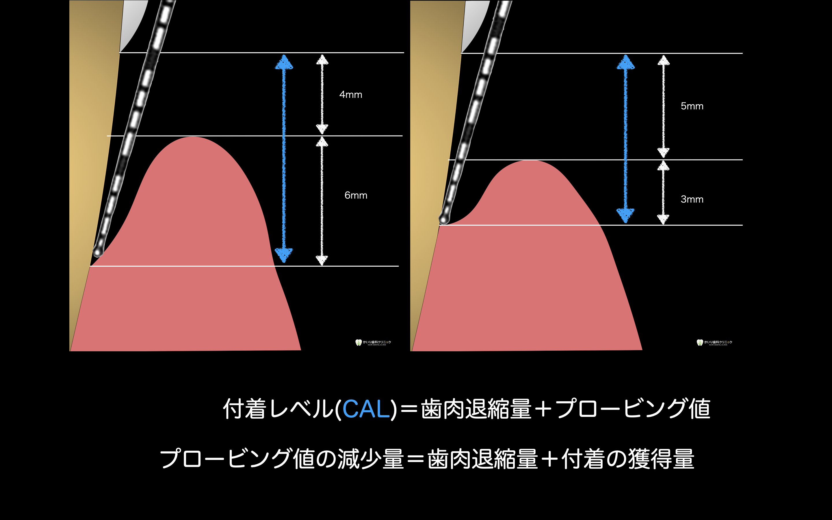2回のメンテナンスの間に何ミリ歯肉退縮が起こり、何ミリ付着の喪失が起こったのかを計算し、どのような組織の変化があったかを考察を述べよ。