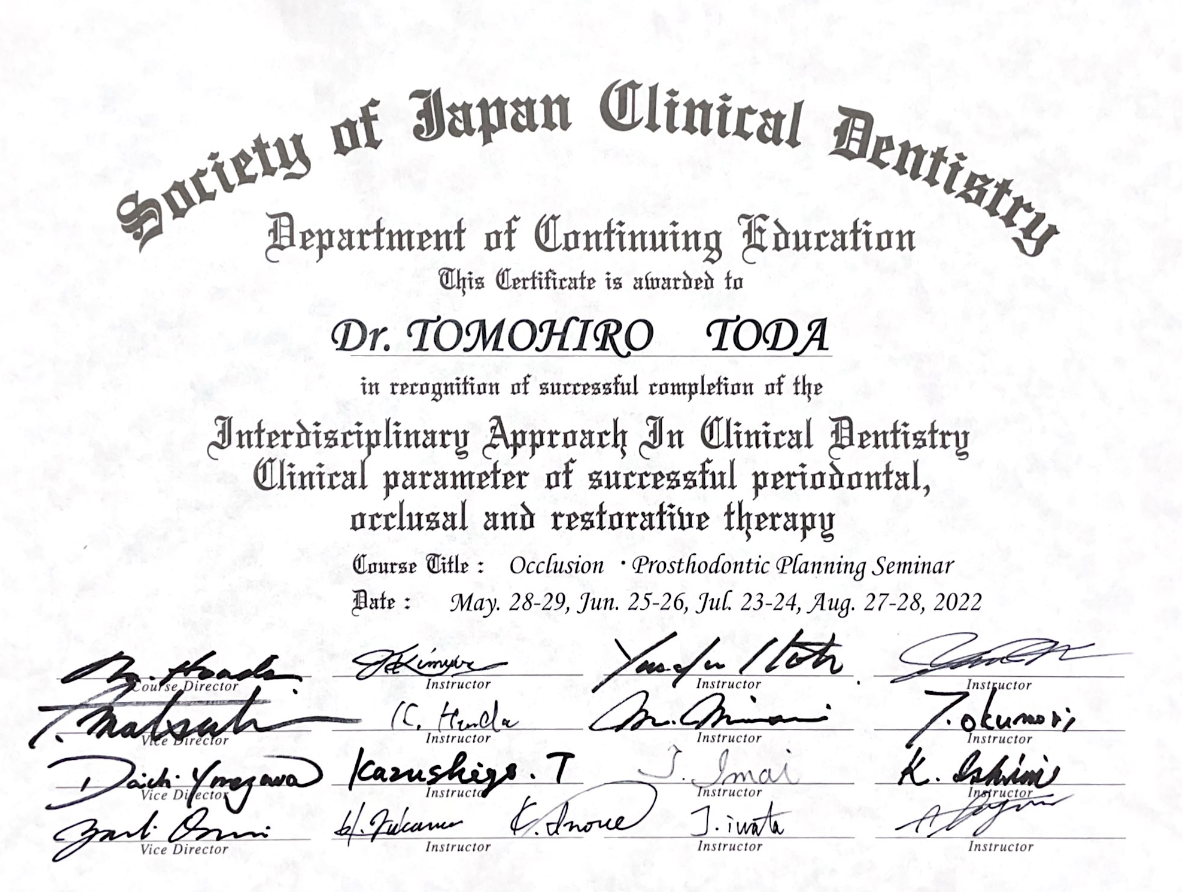 院長の戸田です。2022年5月から4ヶ月間、本多正明先生主催の『咬合・補綴治療計画セミナー』に参加させて頂いており本日無事修了する事ができました。