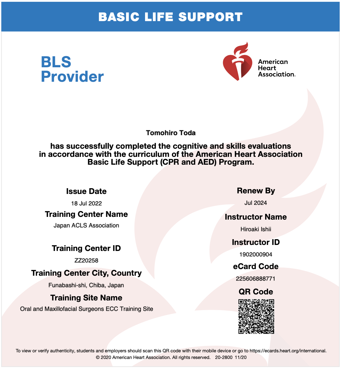 本日、7月18日海の日ににAHA(American Heart Association=アメリカ心臓教会)のBLS(Basic Life Support=一次救命処置)のプロバイダーコースを受講し、成人と乳児の一次救命のスキルチェックテストと筆記試験を受けて、無事BLSプロバイダーとなりました事をご報告申し上げます。